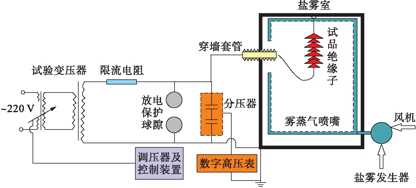 本试验采用GB/T 26218-2010《污秽条件下使用的高压绝缘子的选择和尺寸确定》标准,该标准第5部分可适用于直流系统聚合物绝缘子.试验采用盐雾闪络方法,即基于等值盐密法通过一定浓度的氯化钠(NaCl)溶液来等效绝缘子自然界积污受潮的情况.试验步骤包括试品洗涤、盐溶液配制、试品污染处理及试品加压试验[10].