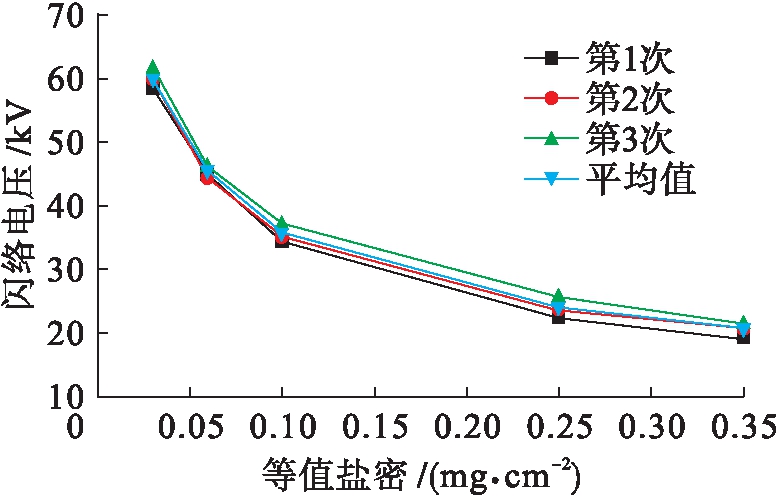清洗绝缘子污秽物的自来水电导率应小于等于0.001 S/m,用水量取决于绝缘子的表面积.本文由FZSW-10/4型号复合支柱绝缘子的实际尺寸计算出伞裙表面积为380 cm2,本次试验用水量为100 mL.加压方式采用均匀升压法避免升压速度对局部电弧发展的影响[11],盐液浓度计算公式为