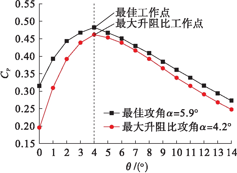由图5可见,在其它因素相同的条件下,采用最佳攻角比采用最大升阻比攻角的CP值显著提高.两曲线CP值均在θ=4°时达到极大值,两极值点分别称为最大升阻比工作点和最佳工作点,对应CP值分别为0.462 0和0.482 1.可见最佳工作点比采用最大升阻比工作点时,CP提高了4.3%.