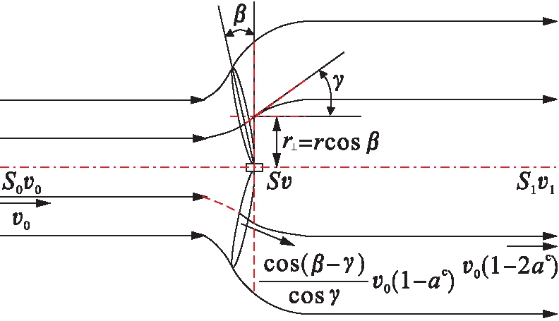 式(3)说明风轮上、中、下游的气流截面积逐渐增大,表明在风轮处气流除具有平行于风轮旋转轴的轴向速度外,同时具有垂直于旋转轴的径向速度分量,这为进一步引入风轮锥角β提供了依据.