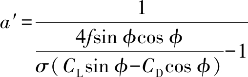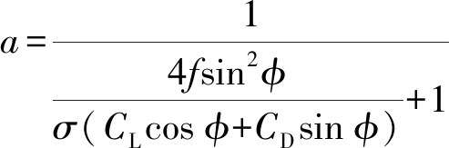 分别将式(4)、(6)及式(5)、(7)建立等量关系,并引入普朗特叶尖损失因子f,可计算出轴向诱导因子a及周向诱导因子a′为