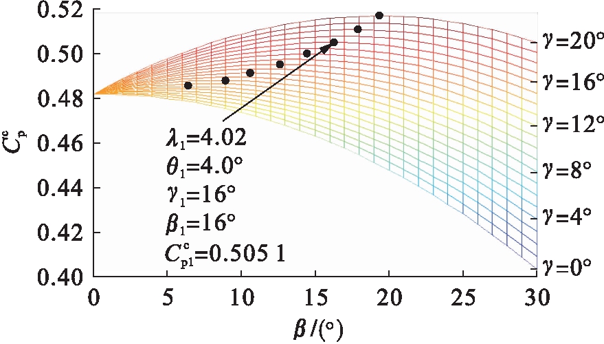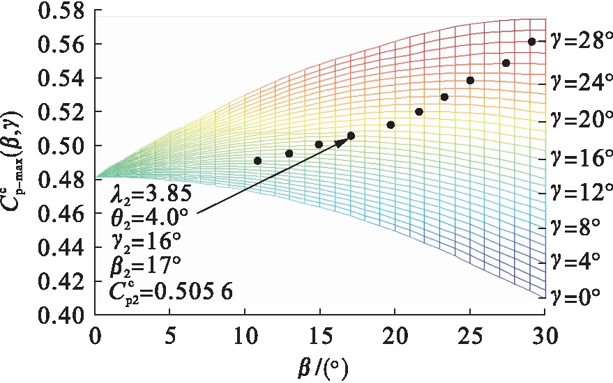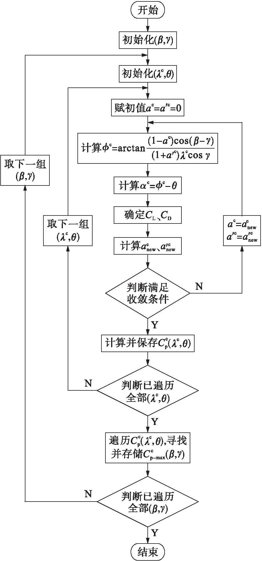 将(λc,θ)参数组作为内层循环变量,将(β,γ)参数组作为外层循环变量.通过式(21)~(25)迭代确定诱导因子修正值ac及a′c,并通过式(27)计算出风能利用系数修正值内层循环(λc,θ)每遍历一次,搜寻该次遍历所得风能利用系数最大值