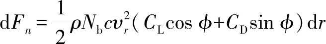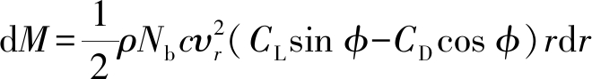 式中:Nb为叶片数;c为叶素弦长;CL、CD为风力机翼型升力、阻力系数;φ为入流角,其表达式为