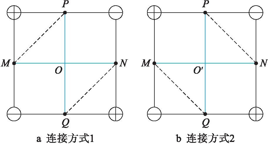 利用泊松曲面重建算法提取等值面时,需逐点判断各个面片是否存在两种连接方式.将各个顶点函数值与等值面阈值进行比较,大于阈值的点记为1,小于阈值的点记为0.在同一个小面片中,若值为1和0的点分别位于对角线的两端,则存在两种连接方式,存在二义性的可能.图4为两种连接方式产生的二义性示意图.