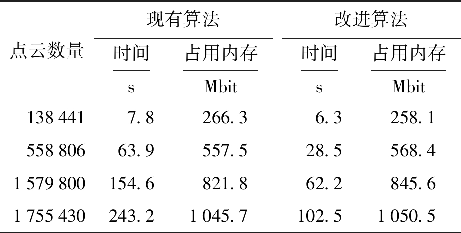 通过对实验数据的分析不难看出,改进算法较现有方法的时间复杂度低,算法效率高.表2为改进算法与现有算法在处理不同规模的点云数据时所用的时间与空间对比.通过表2可以看出,改进算法虽然在内存占用上有时稍高于现有算法,但在处理相同规模点云时,改进算法相较于原有算法所用时间有着显著的差别,且当点云规模越大时,所用时间差别越明显.