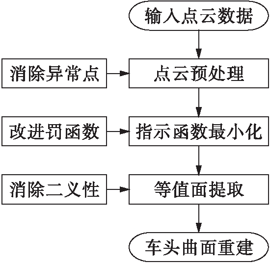 本文基于泊松曲面重建算法,在其点云数据预处理问题、最小化问题与提取等值面问题方面提出了不同的解决方法.在点云数据预处理方面,本文采用一种混合滤波器来去除点云数据的噪声,有效地提高了重建的精度和效率;在最小化问题方面,现有方法基本使用最小二乘罚常数,本文则利用平方范数作为罚常数,有效地控制了重建时间和曲面精度;在提取等值面方面,本文对原有算法[12]进行了改进,消除了原有算法中二义性对提取等值面的影响,获得了比较精确的车头表面三维模型.改进后的重建算法流程如图2所示.