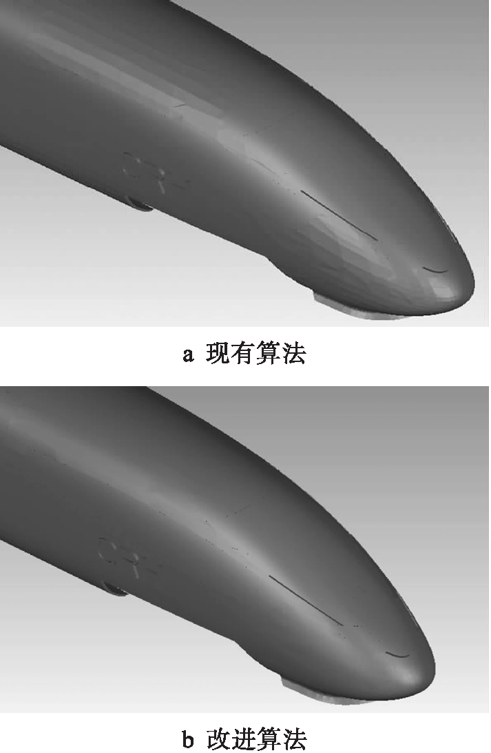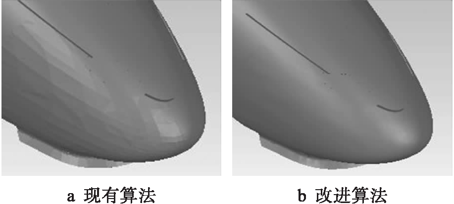 图8为采用现有算法与本文算法的细节放大对比图.采用本文方法重建后的模型光顺性较好,通过对点云数据的预处理与对提取等值面方法的改进,滤除了大量异常点,减少了错误拼接的可能,各个小面片之间的拼接更为合理,使得整个重建曲面更加光滑,较好地还原了原始车头模型.