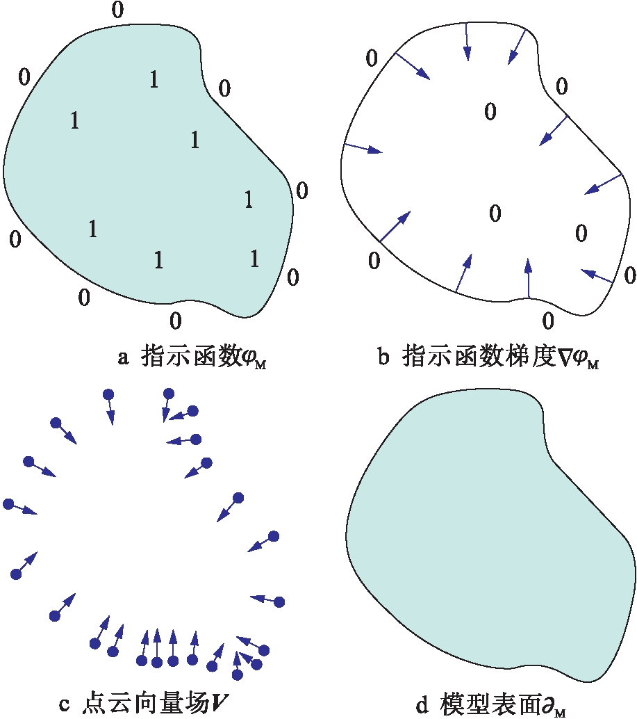 求取模型表面∂M的最终目标是求取指示函数φM,若点在∂M内,则φM=1;若点在∂M外,则φM=0.若要获得指示函数φM,只要解出有向点云数据样本中每点的内法线是指示函数的梯度,即