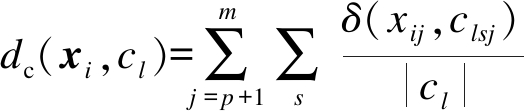 式中:为分类属性数据到聚类集cl的距离;clsj为类cl中第s个数据对象的第j个属性值;|cl|为类cl中已有数据对象的个数.利用定义1和定义2确定混合属性数据度量公式.