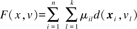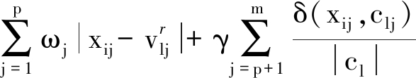 式中:vl为类cl的聚类中心,cl为聚类集;μil为数据对象xi对类cl的隶属度,0≤μil≤1;d(xi,vl)为混合属性数据度量公式,即