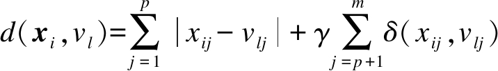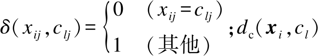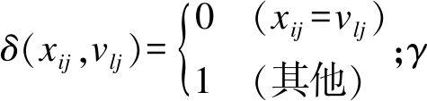 k-prototypes算法能够聚类由数值属性和分类属性组成的混合数据集,该算法将k-means算法与k-modes算法相结合,在聚类过程中引入参数γ来控制分类属性数据对聚类结果的影响程度.设X={x1,x2,,xn}表示由n个数据对象组成的数据集,其中xi(1≤i≤n)具有m个属性A1,A2,,Ap,Ap+1,,Am,其中,A1,A2,,Ap为数值属性,Ap+1,Ap+2,,Am为分类属性,用Dom(Aj)来表示属性Aj的值域,数值属性值域用连续值表示,分类属性值域用有限的、无任何自然顺序的集合表示,如颜色、血型、性别等,通常用Dom(Aj)=来表示,其中nj为属性Aj的数目.数据集中对象xi∈X可以用m维向量来表示,即xi={xi1,xi2,,xip,xi(p+1),,xim},其中xij∈Dom(Aj).