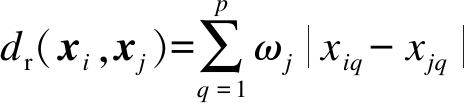 定义1 数值属性度量采用加权曼哈顿距离公式,数据对象xi与xj之间的度量计算定义为