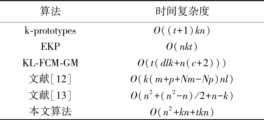 算法时间复杂度k-prototypesO((t+1)kn)EKPO(nkt)KL-FCM-GMO(t(dlk+n(c+2)))文献[12]O(k(m+p+Nm-Np)nl)文献[13]O(n2+(n2-n)/2+n-k)本文算法O(n2+kn+tkn)