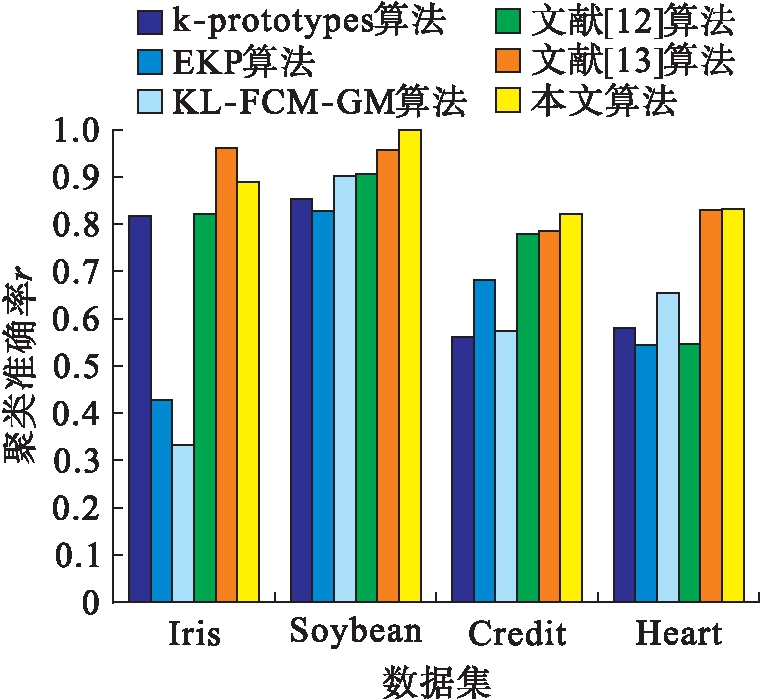 从图1可以看出,本文算法在处理Soybean数据集、Credit数据集和Heart数据集时,聚类准确率都高于其他算法,只有在处理Iris数据时,低于文献[13]算法,但优于其他算法.这说明本文算法在处理混合型数据和分类型数据时有效性更高,而处理数值型数据有待提高.