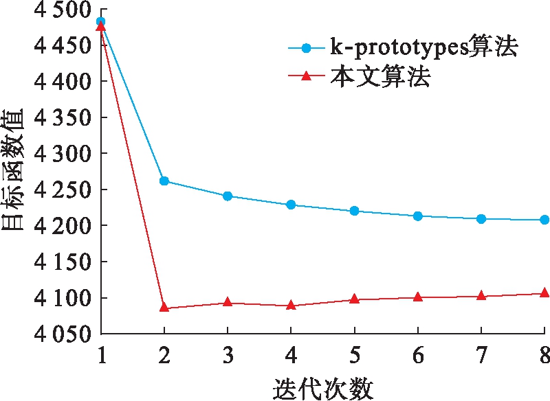 从图2可以看出,目标函数值均随着迭代次数的增高而降低,但是在相同条件下,本文算法的目标函数值比k-prototypes算法低,说明本文算法的聚类精度比k-prototypes算法高.