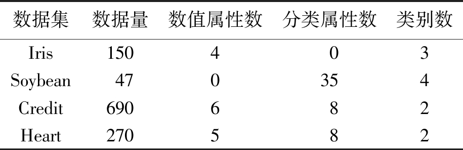 以上4个数据集包括3种数据类型,其中Iris为数值型数据,Soybean为分类型数据,Credit和Heart为混合型数据.