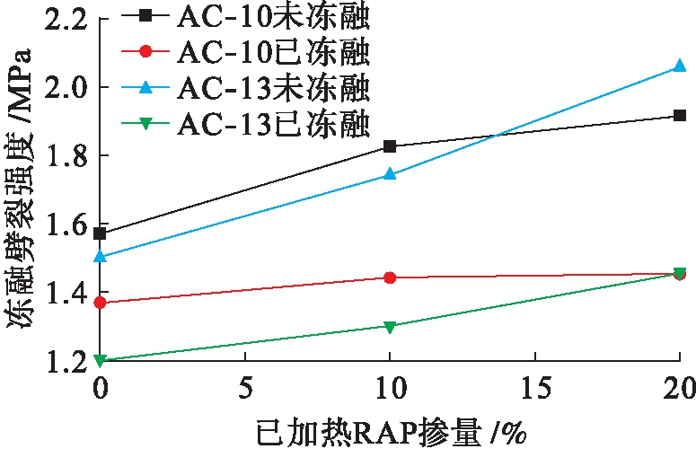 Fig.1 Freezing-thawing splitting strength of heated RAP