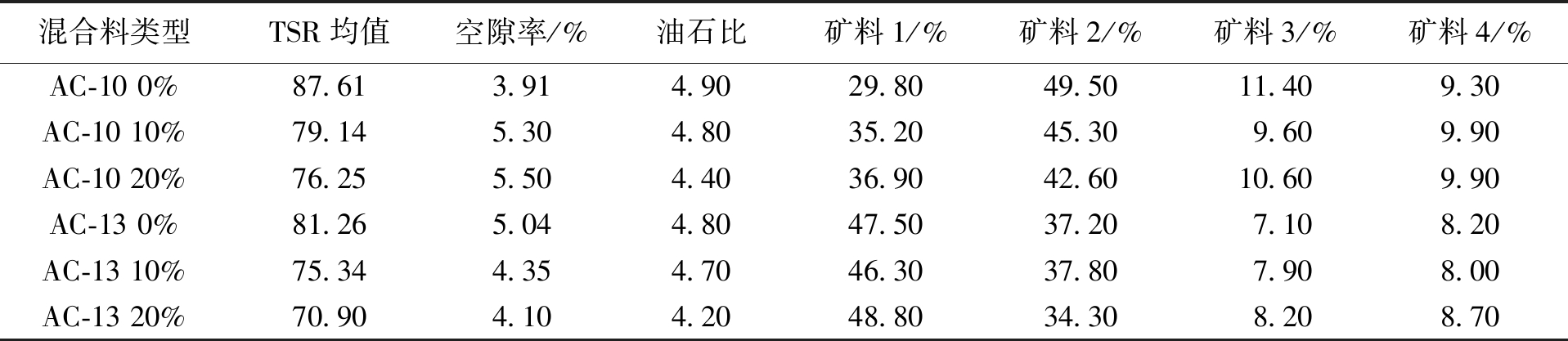 混合料类型TSR均值空隙率/%油石比矿料1/%矿料2/%矿料3/%矿料4/%AC-10 0%87.613.914.9029.8049.5011.409.30AC-10 10%79.145.304.8035.2045.309.609.90AC-10 20%76.255.504.4036.9042.6010.609.90AC-13 0%81.265.044.8047.5037.207.108.20AC-13 10%75.344.354.7046.3037.807.908.00AC-13 20%70.904.104.2048.8034.308.208.70