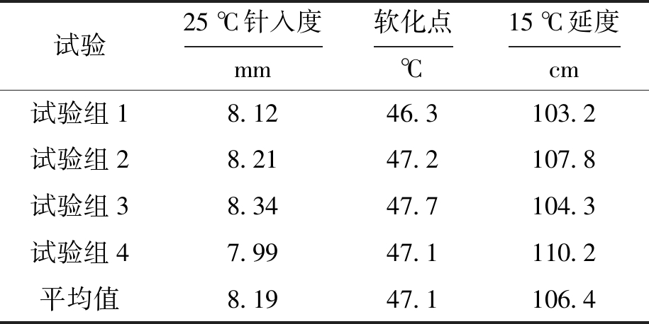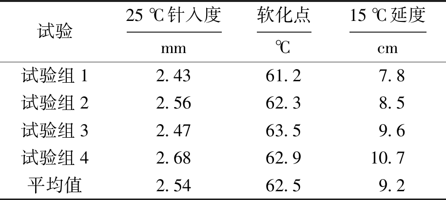 试验25℃针入度mm软化点℃15℃延度cm试验组18.1246.3103.2试验组28.2147.2107.8试验组38.3447.7104.3试验组47.9947.1110.2平均值8.1947.1106.4
