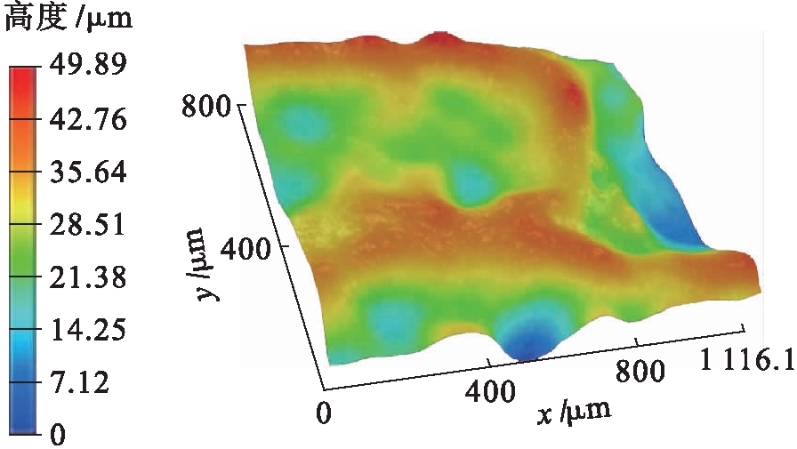 对于沥青质而言,其许多极性分子,如—OH、—NH2和—COOH等会引发沥青质向沥青与水分子界面处活动,在表面形成强的结构膜[7].沥青质分子结构产生位移倾向.为了具体研究集料与沥青之间的界面变化,采用超景深显微镜在放大300倍条件下进行逐层扫描,并将每一次扫描进行合并[8],得到的平面图和3D海拔图如图6、7所示.