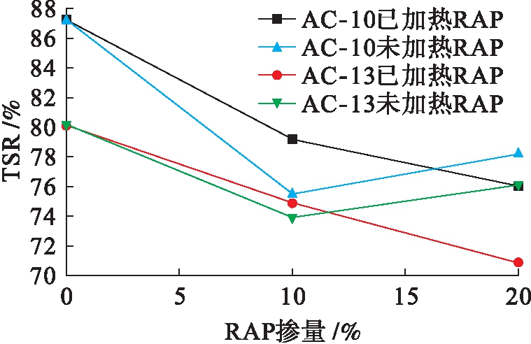 冻融劈裂强度比(TSR)是衡量沥青混合料抗冻性的关键指标.图3为冻融劈裂强度比变化图.由图3可以看到,RAP含量在0%~20%时,其劈裂强度比在《沥青路面施工技术规范》(JTG F40-2004)标准的范围内.AC-10的冻融劈裂强度比远远大于AC-13,这是因为AC-10的细集料较多,从而能够提高抗冻性.随着RAP的增加,结合料中老化沥青所占比例增多,粘结性能不如新的沥青好,使得其劈裂强度比下降[4].对于加热或者不加热的RAP,随着RAP掺量不断增多,其与新旧沥青、矿料等结合都会出现不均匀的问题,从而导致粘附性下降.