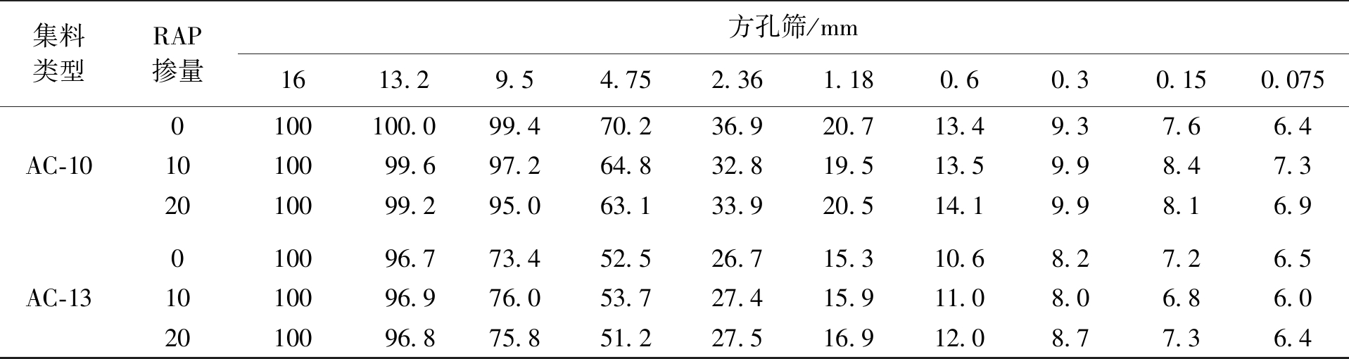 试验中RAP材料加入量分别为0%、10%、20%,其中,RAP含量为其占混合料的百分比.混合料中的配合比具体要求如表5所示.