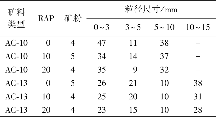 矿料类型RAP矿粉粒径尺寸/mm0~33~55~1010~15AC-1004471138-AC-10105341437-AC-1020435932-AC-130526211038AC-1310425201031AC-1320423151028