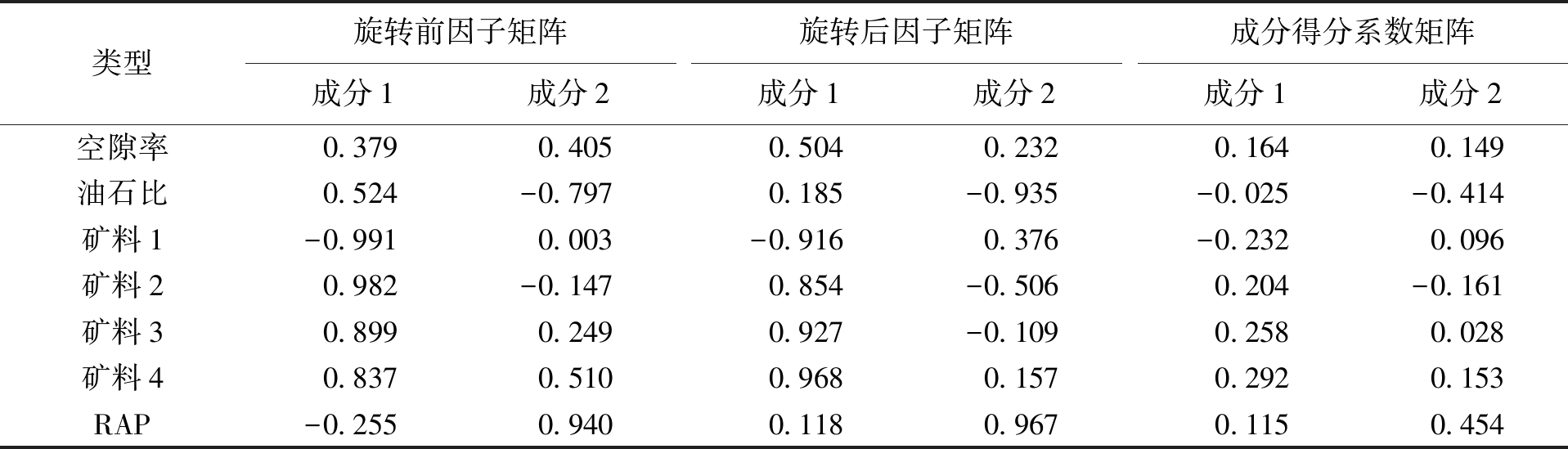 类型旋转前因子矩阵成分1成分2旋转后因子矩阵成分1成分2成分得分系数矩阵成分1成分2空隙率0.3790.4050.5040.2320.1640.149油石比0.524-0.7970.185-0.935-0.025-0.414矿料1-0.9910.003-0.9160.376-0.2320.096矿料20.982-0.1470.854-0.5060.204-0.161矿料30.8990.2490.927-0.1090.2580.028矿料40.8370.5100.9680.1570.2920.153RAP-0.2550.9400.1180.9670.1150.454