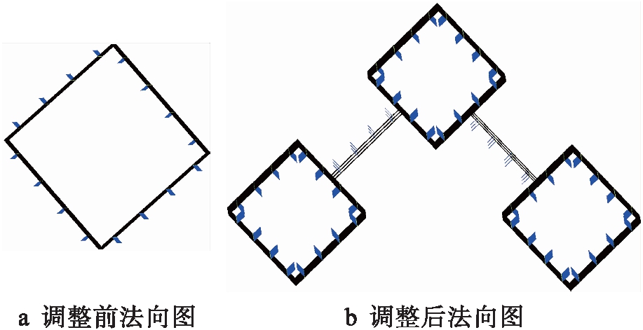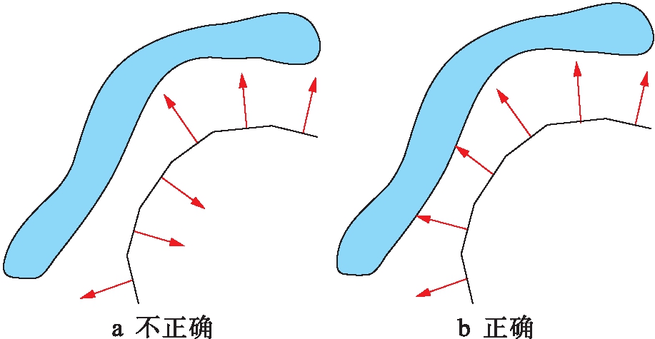采用MPC算法可以实现不连续且自由度不协调的网格单元之间的连接、不同单元类型之间的连接,以及施加荷载或约束条件等功能.在有限元建模过程中,需要对接触单元的接触方向进行定义.接触面与目标的外法线方向必须互指,同时接触单元与目标单元的单元法向也必须互指(见图6),否则在开始有限元计算前,程序可能认为二者之间存在过度侵入并难以找到初始解,此时程序会立刻停止运行.