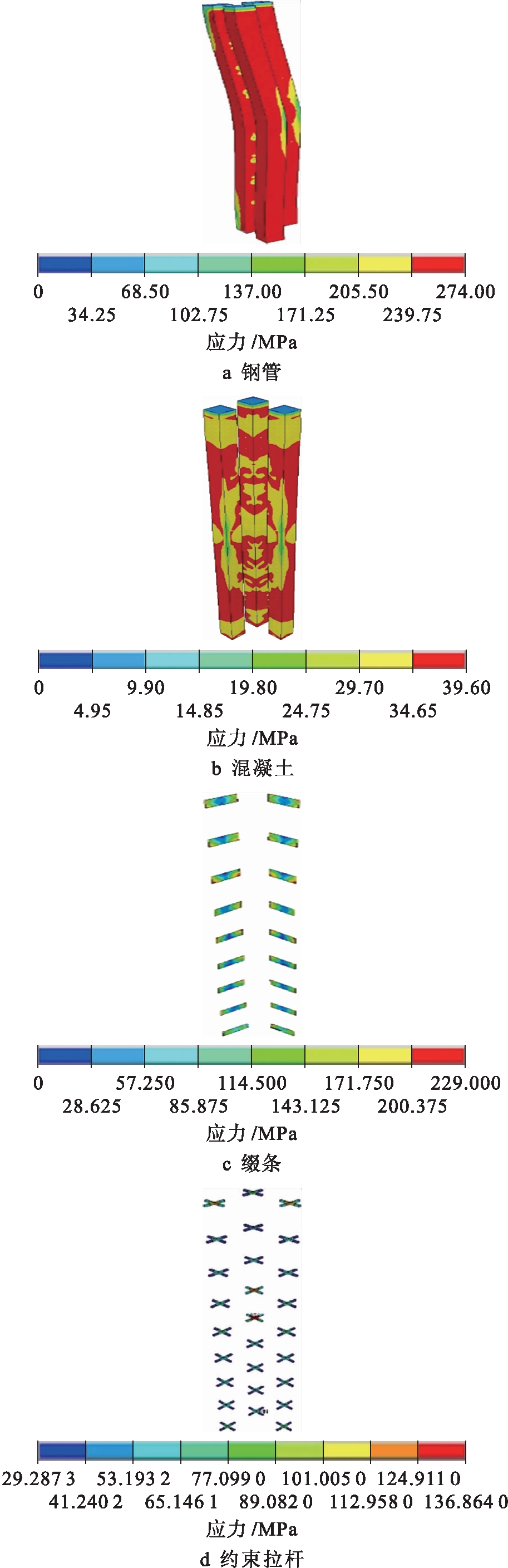 通过ANSYS通用后处理,可以得到长柱试件破坏时的等效应力云图,结果如图12所示.由图12a、b可知,当带约束拉杆L形方钢管混凝土组合异形长柱试件破坏时,钢管和混凝土都达到了极限应力.由图12c、d可知,作用于缀条和约束拉杆上的应力较小,且受压侧应力大于受拉侧应力,但两侧均未破坏.