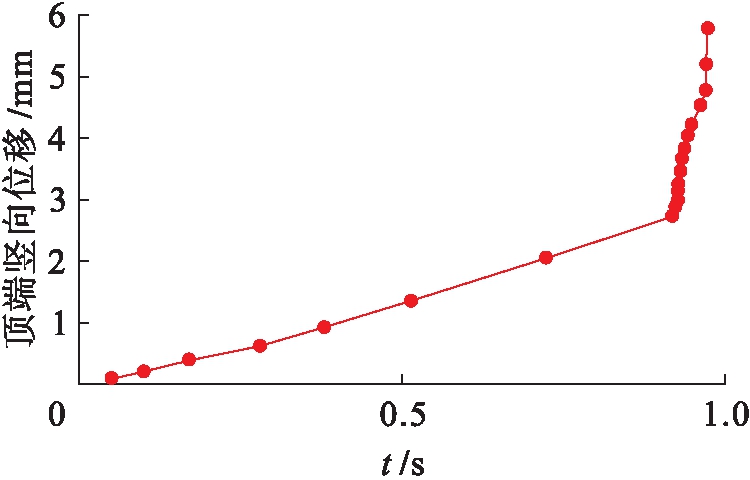 通过ANSYS时程后处理,可以得到带约束拉杆L形方钢管混凝土组合异形长柱顶端竖向位移的位移时间曲线,结果如图10所示.由图10可知,在位移加载前期带约束拉杆L形方钢管混凝土组合长柱的位移呈线性增长,当竖向位移约达到3 mm后,位移突增,并呈现出一定的失稳特点.