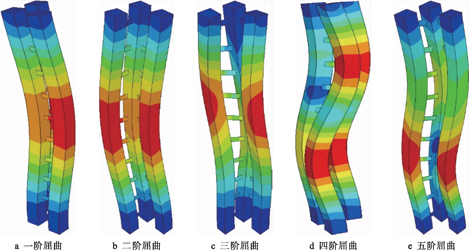 长柱的屈曲分析步骤为:首先进行静力分析,在柱顶面施加单位压力并激活预应力选项,再对其进行特征值屈曲分析,并将特征屈曲分析得到的一阶特征值屈曲模态进行扩展.在ANSYS中的特征值屈曲分析中,通过分析可以得到结构的屈曲荷载系数和相应的屈曲模态,将屈曲系数与外加的单位荷载相乘即可得到屈曲荷载.通过特征屈曲分析得到的长柱五阶屈曲模态如图8所示.由于特征值屈曲分析是非线性屈曲分析的初步评估,因此,在非线性屈曲分析之前,读取千分之一的一阶特征值屈曲变形,将其作为初始缺陷施加到长柱有限元模型中.当对长柱进行非线性屈曲分析时,需要打开自动时间步和大变形效益开关,并在长柱顶端施加由一阶特征值屈曲模态中得到的屈曲荷载系数所确定的临界荷载,之后进行迭代求解直到计算发散为止.