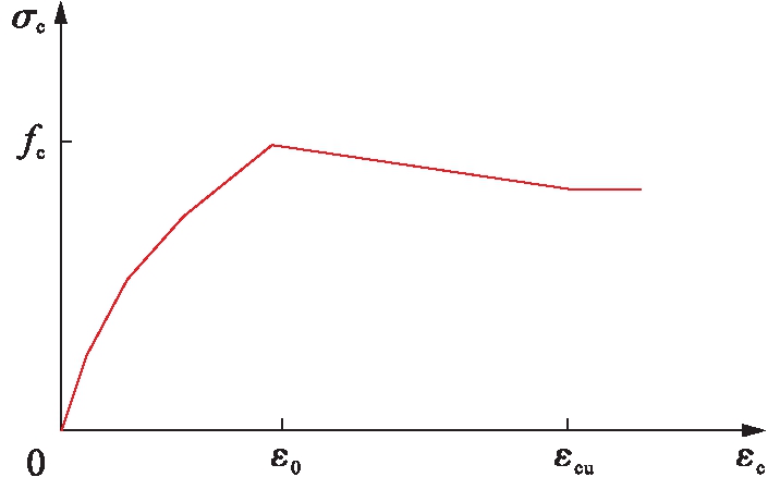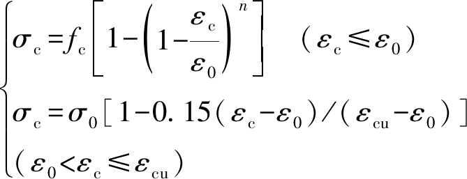 式中:σc为极限抗压强度;εcu为极限压应变,理论分析时εcu=0.003 8,进行构件设计时εcu=0.003;ε0为峰值压应变;σ0=0.85fc,fc为混凝土抗压强度.