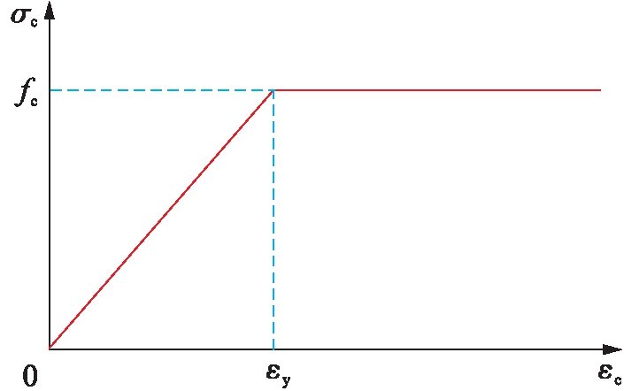 当钢材达到强化阶段时,其变形很大,然而这种情况在实际工程中是不允许的.因此,钢材的本构关系常被简化为理想的弹塑性模型(见图3).对于理想弹塑性模型而言,当应力达到或超过屈服应力后,不需施加任何荷载,变形仍能自由增加.
