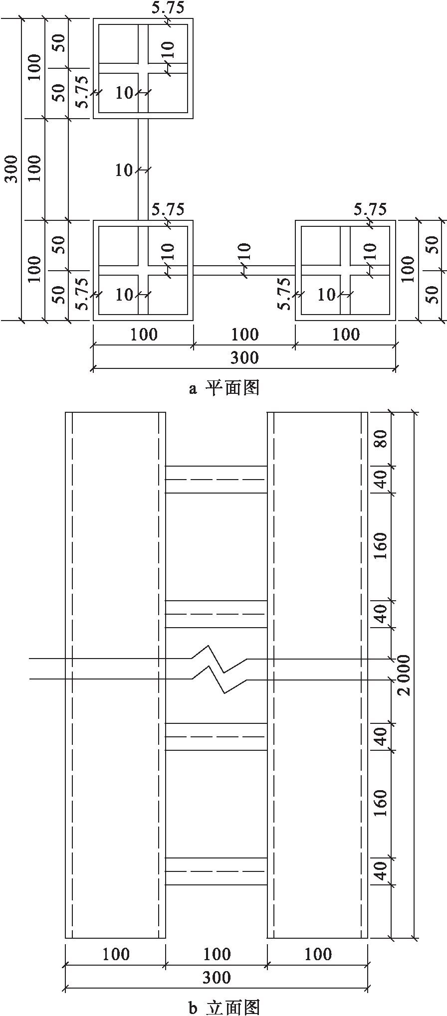 长柱试件柱高为2 000 mm,单肢截面宽为100 mm,因而长柱单肢高宽比L/D=20,钢管截面尺寸为100 mm×100 mm×5.75 mm,缀条尺寸为100 mm×40 mm×10 mm.长柱试件尺寸如图4所示(单位:mm).