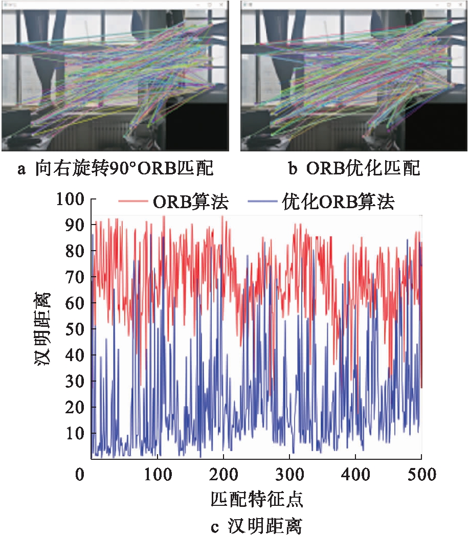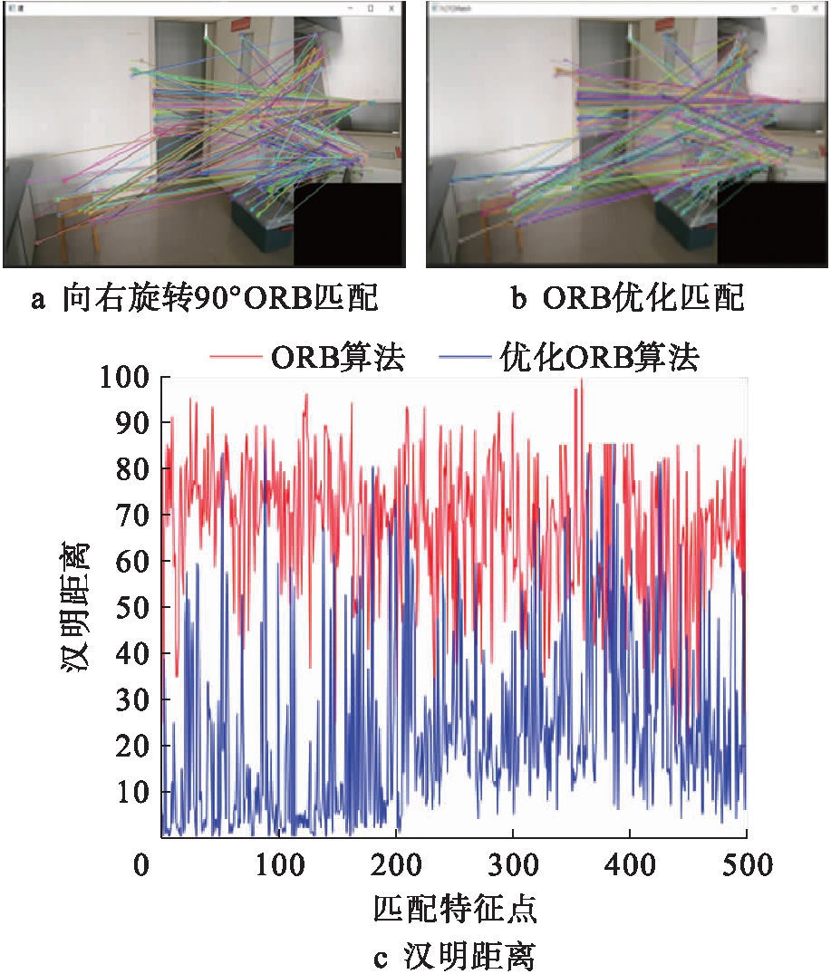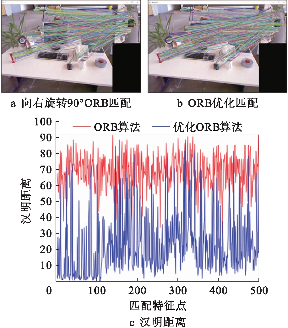 实验环境分别为桌子、地面方向、门以及窗户四个区域.图2将图像向右旋转90°并缩放的ORB匹配实验和优化的ORB算法匹配实验及ORB特征汉明距离对比.通过汉明距离数据对比,可以看出优化ORB算法能够使特征点的描述子更加精确.