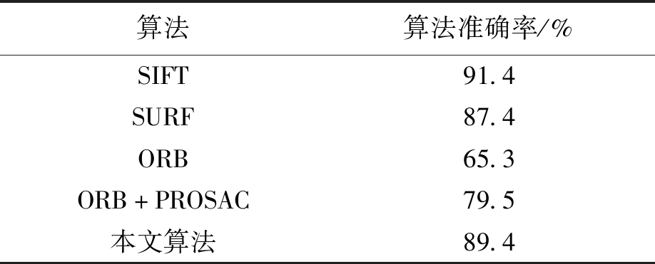 算法算法准确率/%SIFT91.4SURF87.4ORB65.3ORB+PROSAC79.5本文算法89.4