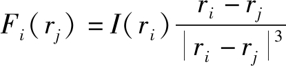 研究人员通过引入自然界内引力的概念,提出了一种图像的力场转换理论.在力场转换理论中,本文将每幅图像当做一个引力场,而力场形成是通过假定图像中任意两个像素点之间存在引力作用,即图像中位置rj的像素点受到位置ri像素点的引力作用Fi(rj),引力大小与ri像素点灰度值成正比,与ri点和rj点间距离的平方成反比.引力方向即两点间连线方向,可表示为