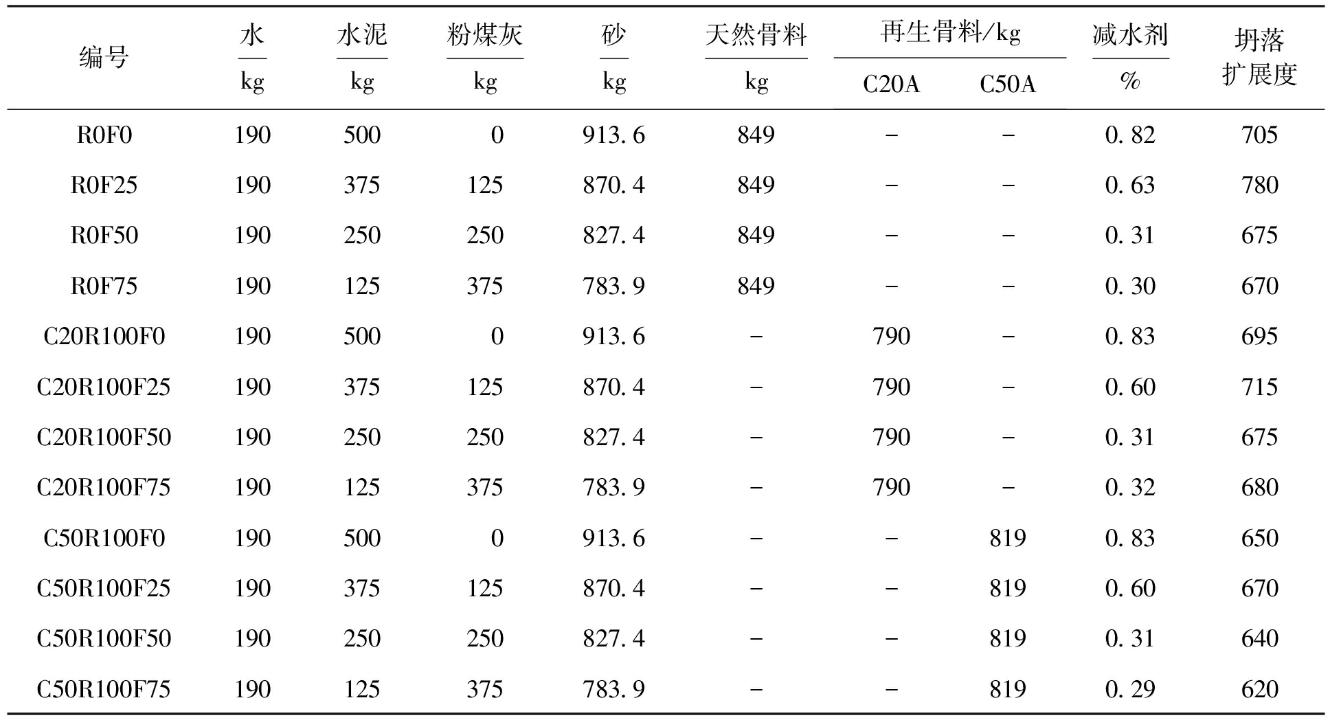 本试验水泥采用的是PO42.5级普通硅酸盐水泥,粉煤灰采用Ⅰ级粉煤灰,其表观密度为2 200 kg/m3,细骨料均采用含泥量小于1%的天然水洗中砂,其表观密度为2 620 kg/m3,天然粗骨料采用辽宁抚顺生产的石灰石碎石,减水剂采用辽宁省建筑科学研究院生产的LJ612型聚羧酸高效减水剂.