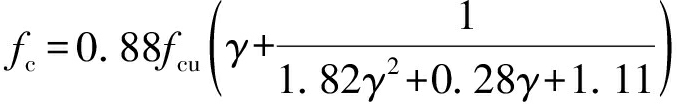 对表3中的试验结果进行回归分析,可得到考虑粉煤灰掺量的立方体抗压强度与轴心抗压强度的关系式,即