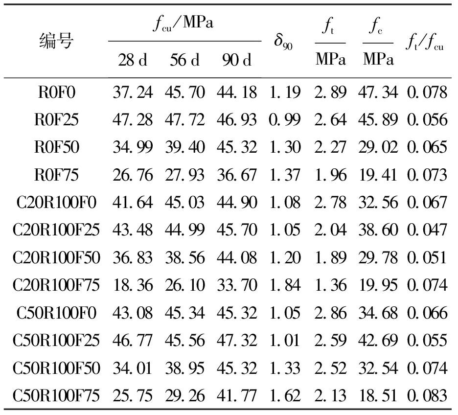 注:δ90为强度发展系数;ft为劈裂抗拉强度;fc为轴心抗压强度.