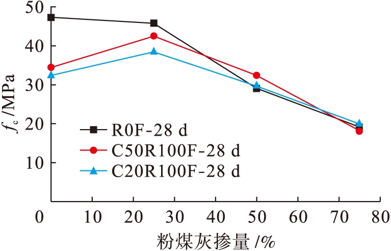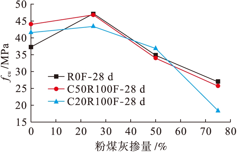 图2为不同粉煤灰掺量对自密实再生混凝土28 d立方体抗压强度fcu影响的关系曲线.由图2可以看出,随着粉煤灰掺量的增加,自密实再生骨料混凝土的立方体抗压强度表现出先增大后减小的趋势,这点与自密实普通混凝土的立方体抗压强度发展规律一致.当粉煤灰掺量在0%~25%时,混凝土的立方体抗压强度随着粉煤灰掺量的增加而变大,这是因为适量的粉煤灰可与水泥中的氢氧化钙充分发生二次水化反应生成凝胶体,有效地填充了再生骨料内部的裂隙和表面的孔洞,改善了自密实再生骨料混凝土的内部结构,起到了提高混凝土抗压强度的作用.而当粉煤灰掺量在25%~75%时,混凝土的立方体抗压强度随着粉煤灰掺量的增加而减小,这是由于过量的粉煤灰取代水泥,减少了水泥用量,使水泥水化反应减弱,这就导致一方面水泥水化反应所贡献的混凝土强度大为降低,另一方面水化产物之一的氢氧化钙产量减少,并且水化反应产生的热量也大为降低,致使粉煤灰二次水化反应受到阻滞,因此,自密实再生骨料混凝土的立方体抗压强度显著降低.由此可见,当粉煤灰掺量为25%时,自密实再生骨料混凝土的立方体抗压强度最高.