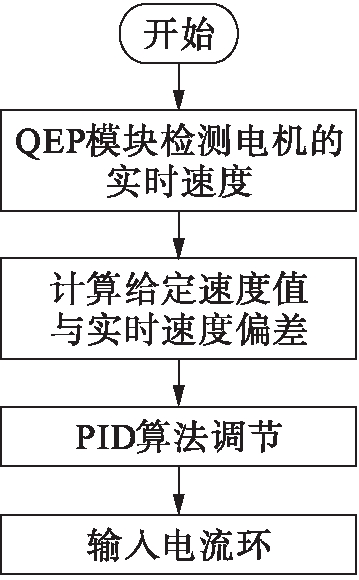 在无刷直流电机的调速系统中,速度的检测和采样等操作主要由QEP模块的光电式编码器完成,其具体过程描述如下:设A、B分别是光电式编码器的两路正交信号,进行光耦隔离,并将其传送给DSP芯片,经过4倍鉴频处理后,最终使用M/T测速方法得到电机的转速,并反馈到系统中.速度环程序的流程图如图5所示.