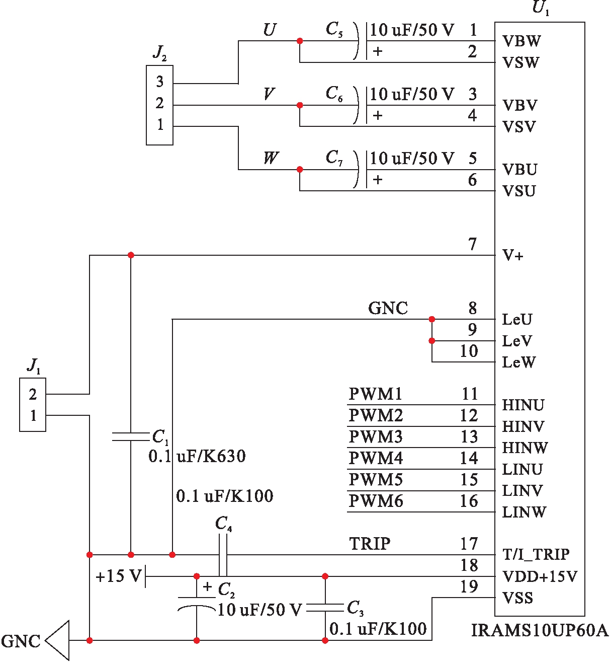 在无刷直流电机的调速系统中,其硬件电路主要包含电源控制、DSP芯片控制、电流检测、转子位置检测、转速检测、保护、功率驱动、显示等电路.其中,调速系统的电源控制电路使用了线性电源、无源电容滤波和整流电路为各个部件供电.功率驱动电路使用集成的IGBT功率器件,实现了系统的换相和转速控制等操作,其具体电路设计如图3所示,其中,显示电路选择74AC245作为显示屏LCD的驱动,实现系统相关信息的反馈。