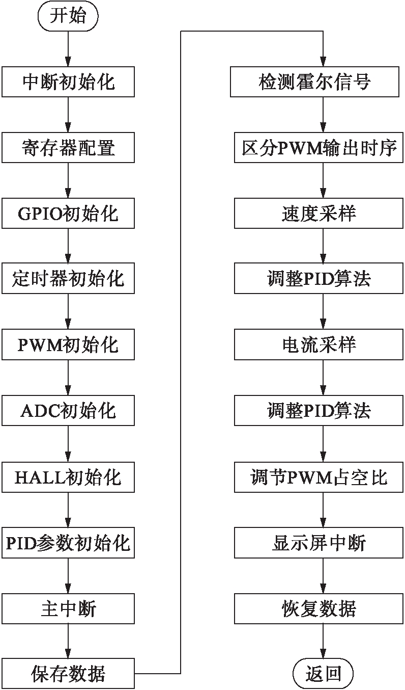 在CCS3.3开发环境中,本文使用C语言编写系统的核心程序,其中包括系统主函数和主中断程序.系统主函数程序需要实现各系统子功能的初始化,这些子功能包括外围时钟、PIE寄存器、GPIO、SCI& FIFO寄存器、CPU定时器、PID算法参数设置、PWM模块、ADC模块和HALL模块等.而在主中断程序中,系统需要具备霍尔信号的检测能力,从而区分PWM模块的输出时序.系统的QEP模块和ADC模块需要具有速度、电流的采样及运算能力,实现PWM调节,从而完成电机的调速.系统的主程序流程如图4所示.