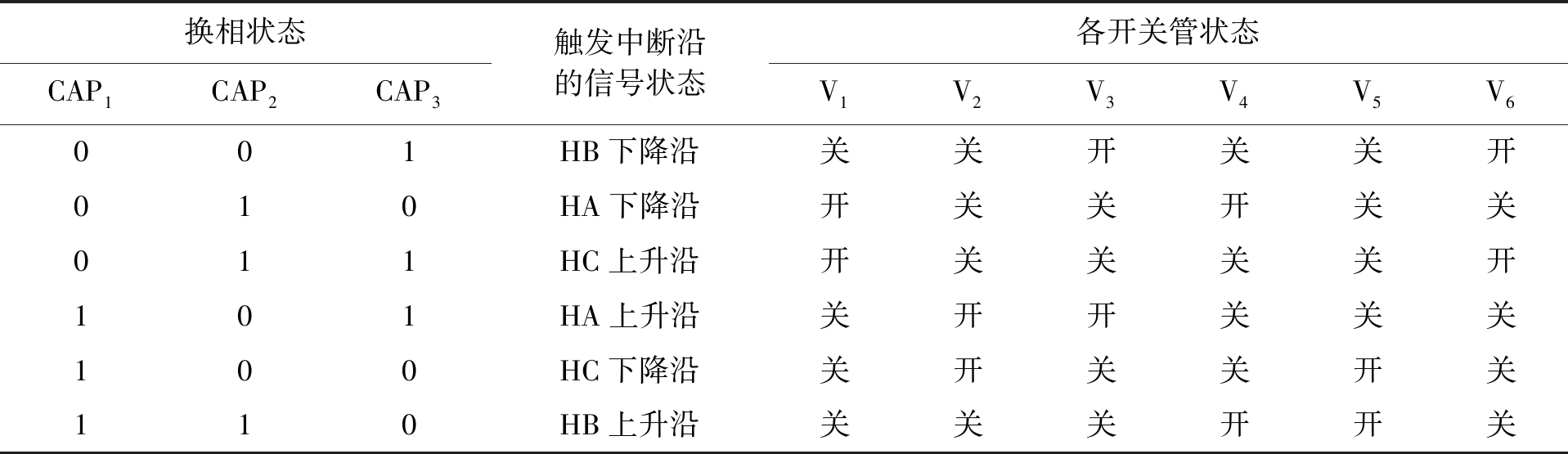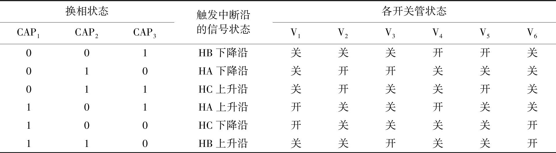 换相状态CAP1CAP2CAP3触发中断沿的信号状态各开关管状态V1V2V3V4V5V6001HB下降沿关关开关关开010HA下降沿开关关开关关011HC上升沿开关关关关开101HA上升沿关开开关关关100HC下降沿关开关关开关110HB上升沿关关关开开关