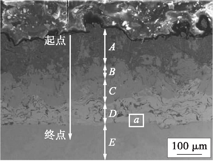 图3为高温氧化2 h后NiAl/Al复合涂层与基体界面的SEM形貌.在800 ℃氧化2 h后,由于氧化温度超过了Al的熔点660 ℃,Al涂层熔化后与NiAl涂层发生了互扩散并发生了冶金反应.图3中A区域为未反应的Al涂层,B和C区域均为扩散层,D区域为剩余NiAl涂层,E区域为基体纯钛,具体能谱分析结果(原子分数)如表2所示.
