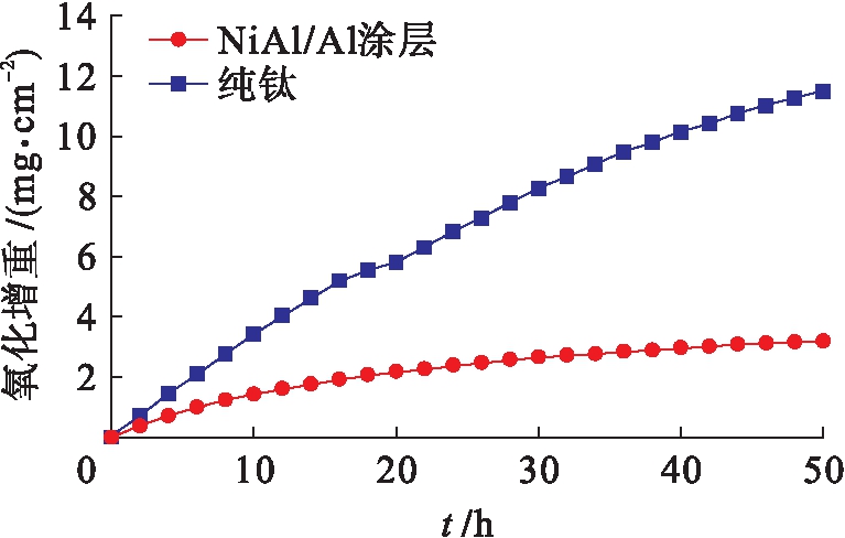 分别对有无涂层的试件在800 ℃空气环境中进行50 h连续氧化并绘制氧化动力学曲线,结果如图12所示.由图12可知,无涂层纯钛试件的氧化动力学曲线近似一条直线,而有涂层试件的氧化动力学曲线符合抛物线规律.前者氧化增重较快,这是因为在氧化过程中纯钛表面形成的TiO2氧化膜对基体不具有保护效果.后者氧化增重较慢,表明高温环境下具有涂层的试件的抗氧化性得到明显提高.高温下NiAl/Al复合涂层中可以形成Ni和Al的金属间化合物,Al与基体纯钛也会形成TiAl3金属间化合物,所形成的化合物均具有充足的Al元素.氧化初期Al元素可与空气中的O元素形成α-Al2O3,因而涂层的氧化增重较快,待形成致密且连续的α-Al2O3氧化膜后,涂层的氧化增重速率降低,因而氧化后期涂层增重并不明显,表明制备的NiAl/Al复合涂层可以显著提高纯钛的抗高温氧化能力.