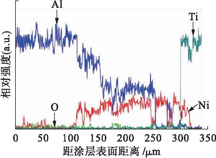 为了探索涂层与基体之间的扩散行为,获得更加准确且宏观的元素分布情况,对图8进行面扫描分析,结果如图10所示.由图10可见,在涂层和基体的结合处Al含量较多,这是因为在氧化过程中生成了富Al的TiAl3相,Ni元素弥散分布在涂层中,O元素在涂层中含量较少,且基体中并未发现O元素,表明涂层表面的α-Al2O3氧化膜及生成的NiAl金属间化合物具有很好的抗氧化性能.