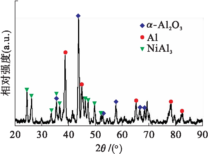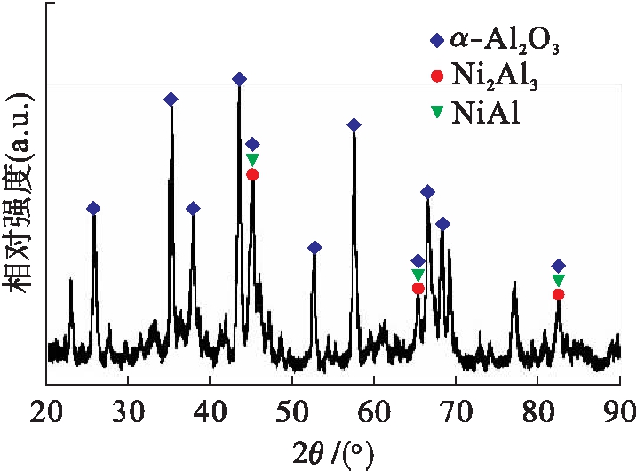 对高温氧化50 h后的试件进行XRD分析,结果如图11所示.与高温氧化2 h后的试件对比后可知,涂层的纯Al层已全部反应,涂层中除含有致密的α-Al2O3外,还含有Ni2Al3、NiAl富铝相,这些富铝相和致密的α-Al2O3氧化膜具有良好的抗氧化行为,可以保护基体免受氧的侵蚀.